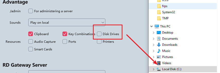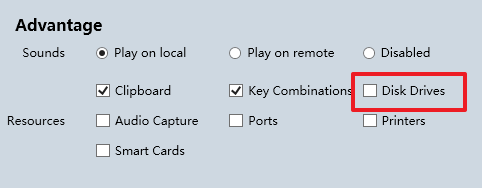 P.S. in PRemoteM option Advantage -> Resources -> unchecking "Disk Drives" have no effect, and connection establishes with connected drives if you haven't unchecked same option in Windows native RPD-parameters window.