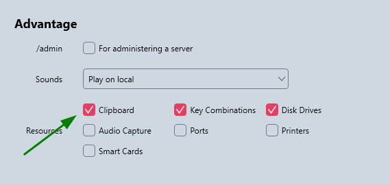 That was the issue. I had imported my connection list from mRemoteNG csv and didn’t realize that there were separate settings for these features. mRemoteNG has settings for the other resources, but I don’t see a setting for clipboard, so I guess that software enables clipboard by default maybe. Anyway, once I checked the Clipboard box, it worked. I will keep giving PRemoteM a try!
