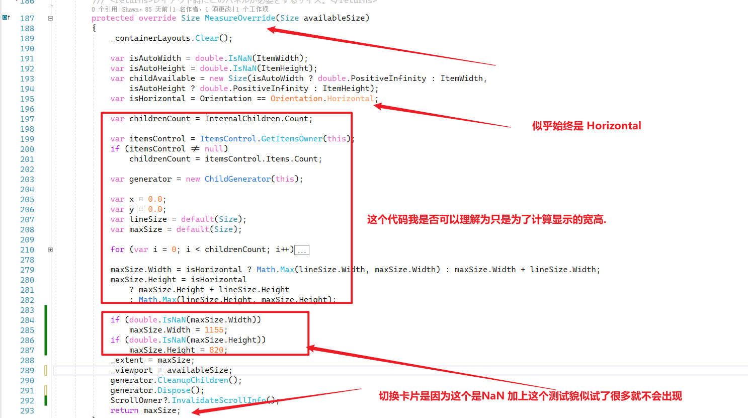 感谢你的 debug,事实上 MeasureOverride 我是直接用的一个日本人写的支持虚拟化的 WrapPanel,MeasureOverride 用处就是计算控件的大小,从而让 WPF 知道应该如何绘制这些控件。MeasureOverride 这一步是绕不开的,WPF 显示控件必须要先调用这个函数,然后再根据算出来的尺寸,来安排控件显示布局。另外isHorizontal 并非是一直为 true 的,而是根据 Orientation 属性变化,当然在 cardview 中,它确实是一直为 true。回头我再仔细看看这里的问题,不过最近我工作较忙,所以没有时间花在这个项目上。
