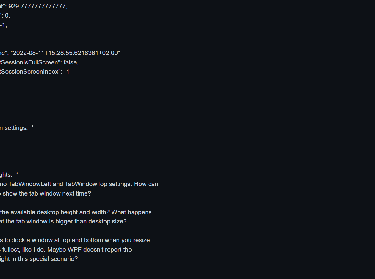 As soon as I move the tab window any nearer to the left/top/bottom, or the tab window is even docked to the top/left/bottom (as I like to do), the height and/or left/top isn't restored.