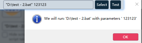 Thanks. The parameters are recognized now. If I click on "Prüfen" (I guess test or check in English) everything works fine. The script is run and the GUI seems to know if it is finished or not.