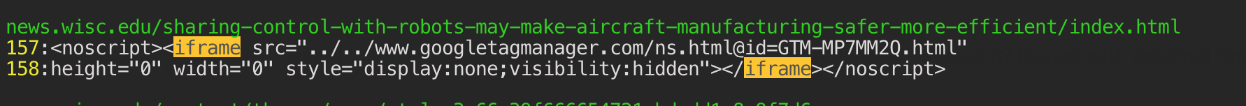 wget -nv -E -k -x -K -H -np -e robots=off --restrict-file-names=windows --timeout=60 --warc-file=archive.warc -p --no-check-certificate "https://news.wisc.edu/sharing-control-with-robots-may-make-aircraft-manufacturing-safer-more-efficient/"I get the folder attached. As far as I can tell: images are local, and all scripts are local... except these two in the index.html file: