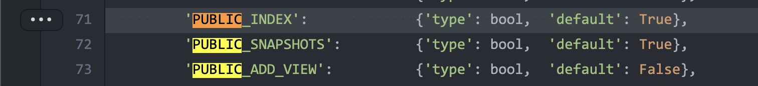 github.com/ArchiveBox/ArchiveBox@e4d2ac432d/archivebox/config.py (L71)You can also manage the Snapshot view/edit/add/delete permissions on a per-user basis under http://127.0.0.1:8000/admin/core/user/