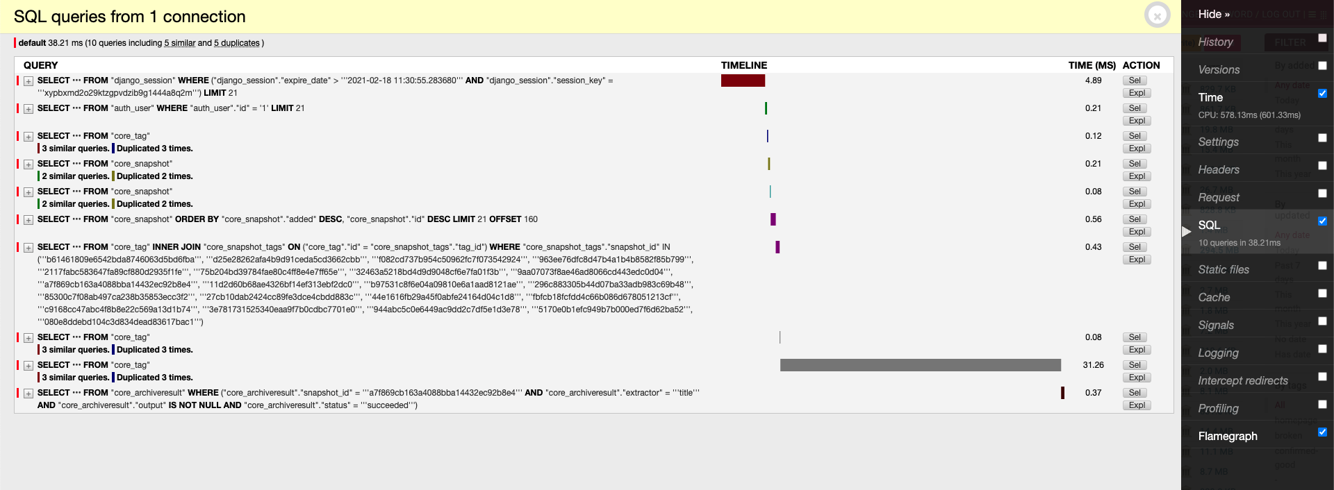 ArchiveResult.objects.filter(snapshot__in=snapshots)all at once instead of a separate query to get the ArchiveResults on each snapshot). Then have some function that takes both QS's and returns the icons that should be shown for each snapshot. It's a relatively straightforward Django optimization process, but I haven't had a chance to get around to it myself as I've been focusing on correctness more than speed in the last sprint.If you want to take a crack at it, go for it, I'd be happy to review any PR to improve the speed here.