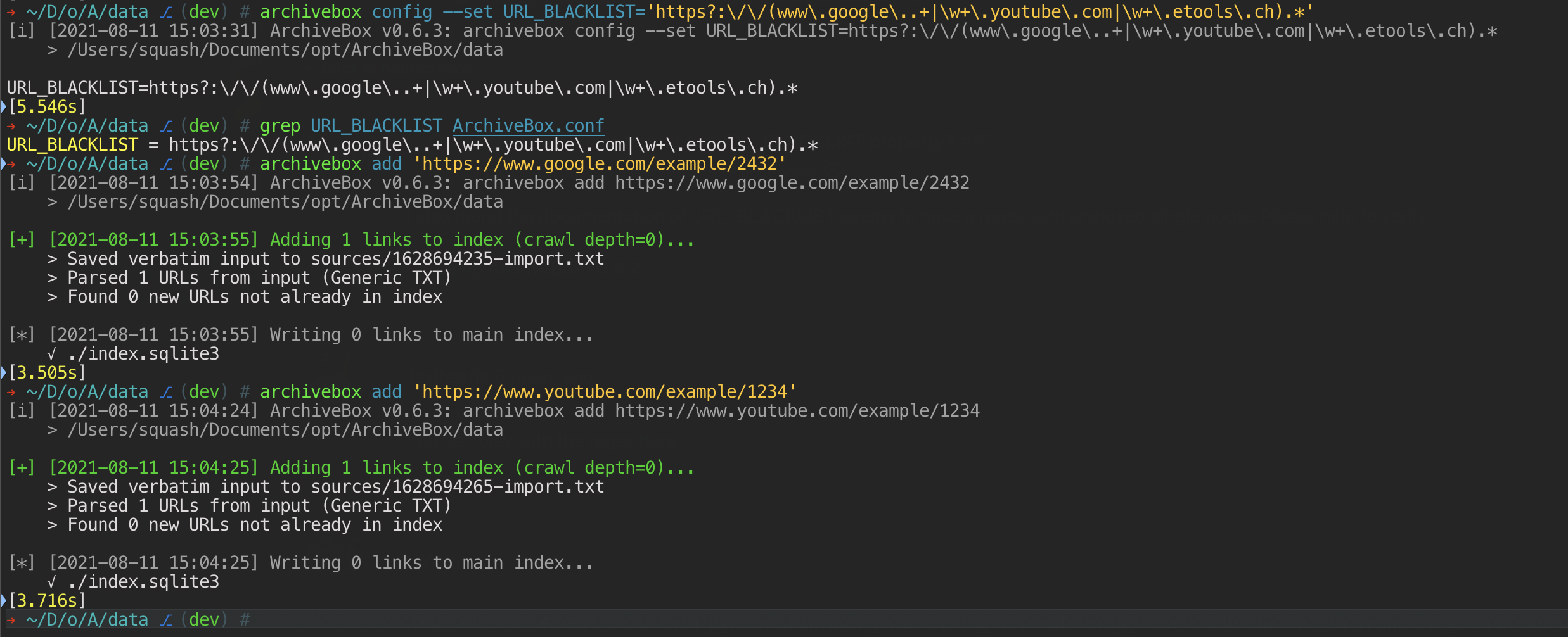 archivebox.confto help me set the correct format to input the regex?I also found the documentation of URL_BLACKLIST seems to have a regex with unclosed single quote. Please help to verify.