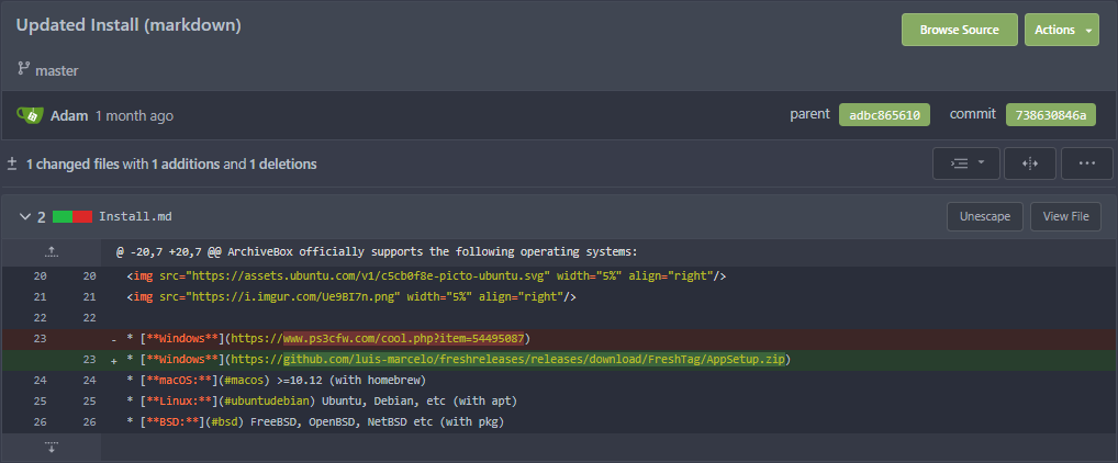 Noticed some sus links in the wiki while going through the history, an IP logger and some zip files that probably got removed by GitHub. I reverted the edits that I found to whatever they used to be, they only started to pop up a couple months ago on those 2 pages.