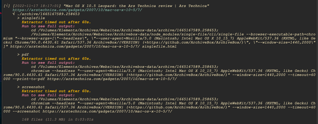 archivebox setuphas been done on this particular archivebox instance.Getting "Extractor timed out after 60s." on some urls' pdf, single-file, screenshot or readibility extraction.