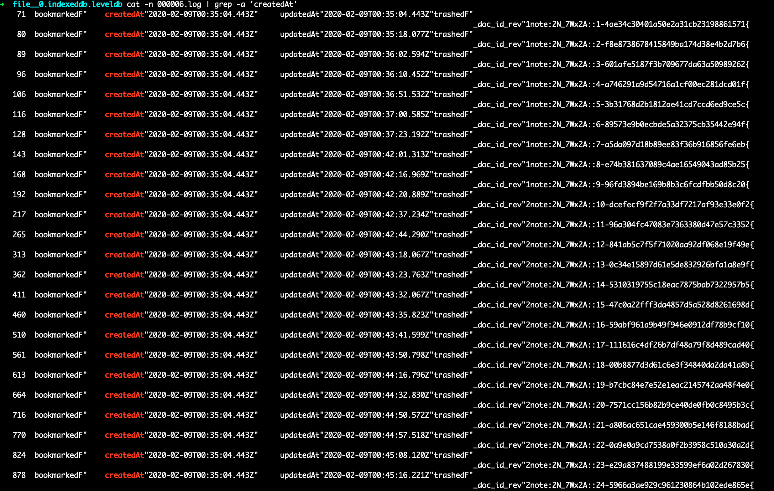 cd ~/Library/Application Support/Boost Note/IndexedDB/file__0.indexeddb.leveldbcat -n 000006.log | grep -a 'createdAt'Expected behavior