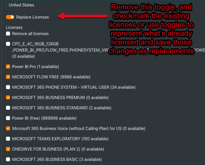 Adding a license to users is error prone with the current workflow since it's a replacement of existing licenses. You have to read through the JSON to understand what's currently assigned, make sure to keep those active, then add whatever is additional. The same problem actually exists during removal of a license. This is common to add/remove for things like PowerBI, etc.