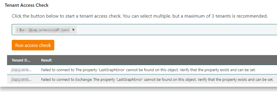 Running an access check on any tenant results in the following message: