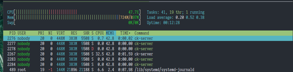 A few ck-server instances are spawned on startup, each taking a gentle amount of memory. However after a while, all these ck-server instances blow up eating hundreds of megs, and then die.