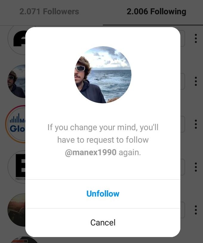 On the phone the unfollow window pops up but nothing happens on the screen. The log says "Next item not found: probably reached end of the screen".