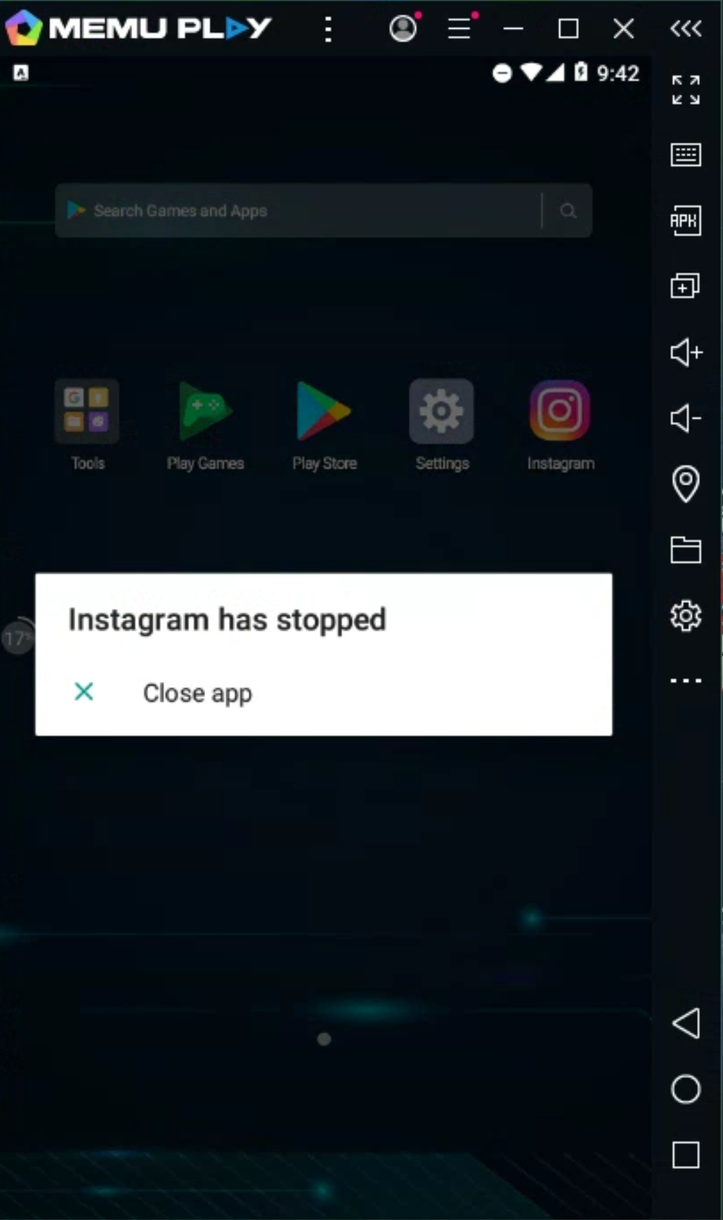 Instagram app v.195.0.0.31.123 non stop crashing on MEmu after first session finished, only way to circumvent this is to erase App data, but after next session loop is finished, the issue repeats itself.