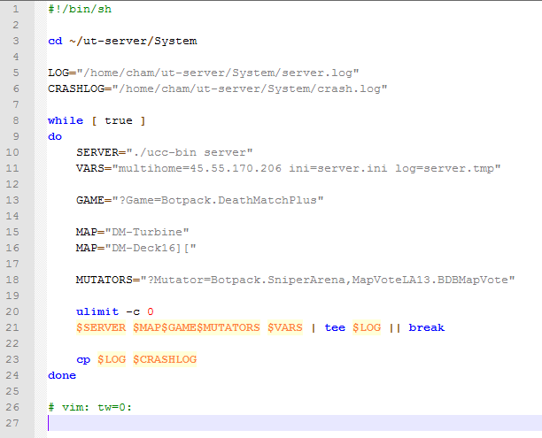 ucc server DM-Deck16][?game=Botpack.DeathMatchPlus ini=server.ini -log=server.log copy server.log servercrash.logUnless the commandline editor is not available, but it is rather needy for server admin use.