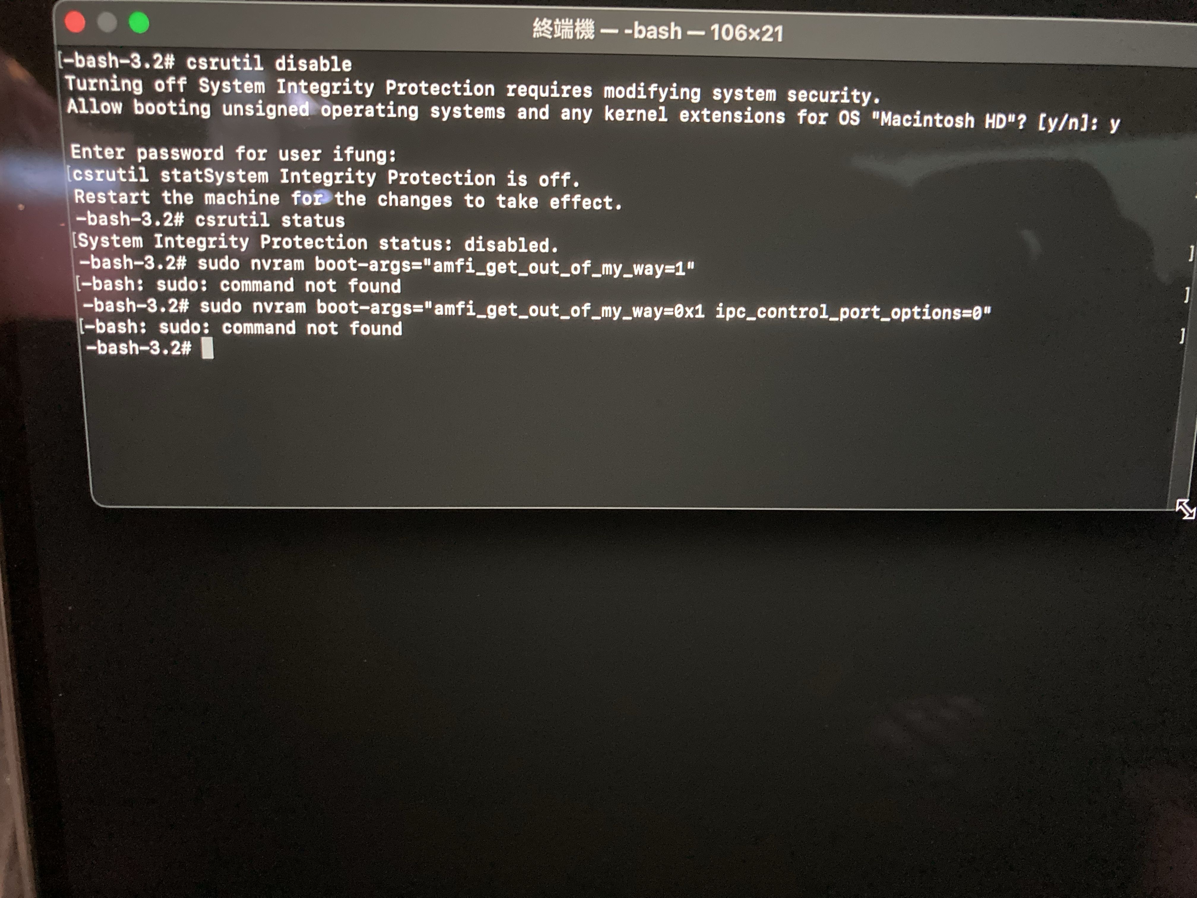 Then copy and paste this command: sudo nvram boot-args="-v cs_enforcement_disable=1 amfi_get_out_of_my_way=1 keepsyms=1 intcoproc_unrestricted=1 amfi_unrestrict_task_for_pid=1 amfi_allow_any_signature=1 cs_debug=1 ipc_control_port_options=0"