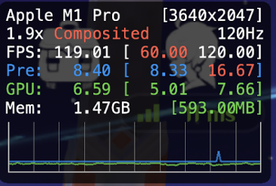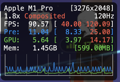 This issue started with a version of nightly build. I can see that the CPU time increases significantly, resulting in a lower frame rate. Even in some cases, it will drop from 110+ fps to 80 fps. In addition, I cannot get stable 120 fps as before. The fps fluctuates around 115. I'm M1 Max, macOS 13.1.