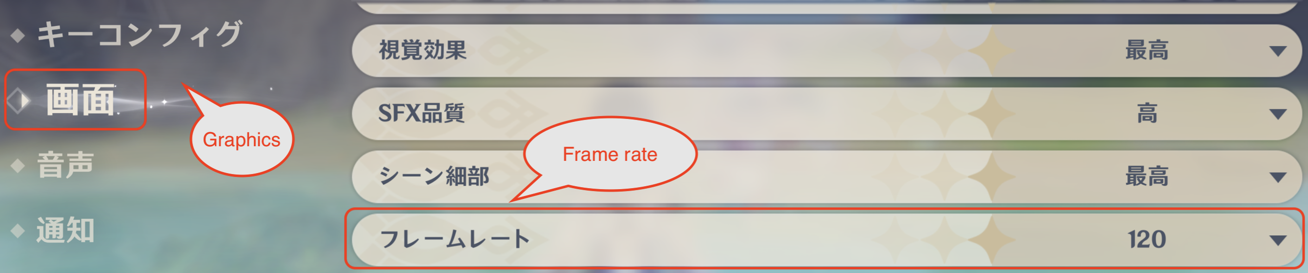 ⬇️ 60 fps setting, 120 fps setting stands for the following setting in game.