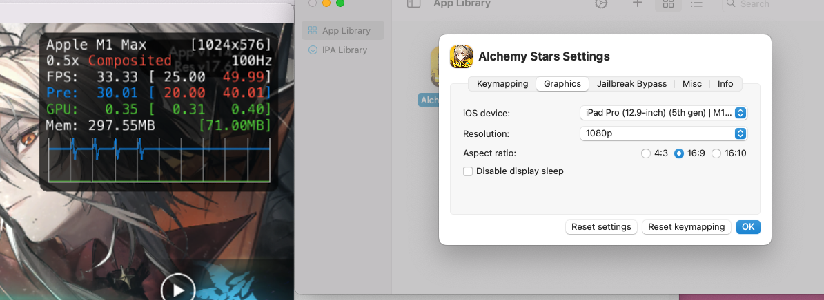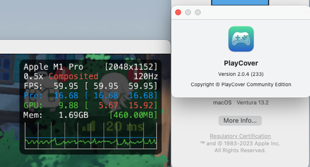 my playcover settings of the game were consistent across the two versions, identifier set to M1, resolution set to auto (1440x900)