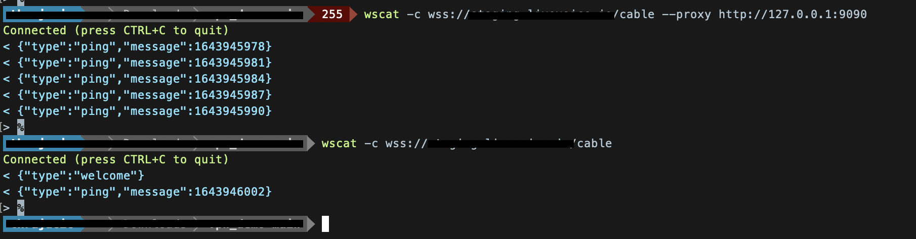 websocatfrom the command line, which also isn't intercepted by Proxyman, and the welcome message appears as expected.P.P.S: I now tried with