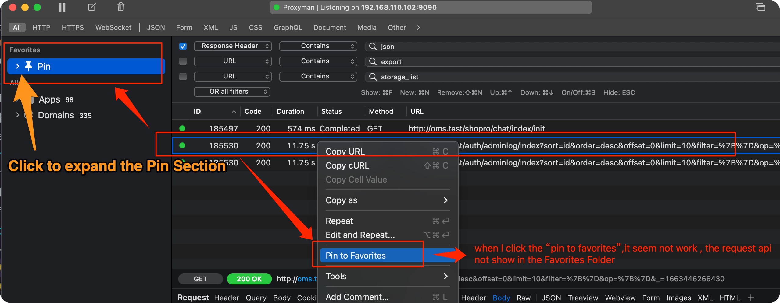 Currently, "Pin to Favorites" when right-clicking on the request, it doesn't pin this particular request (WE haven't implemented it yet).