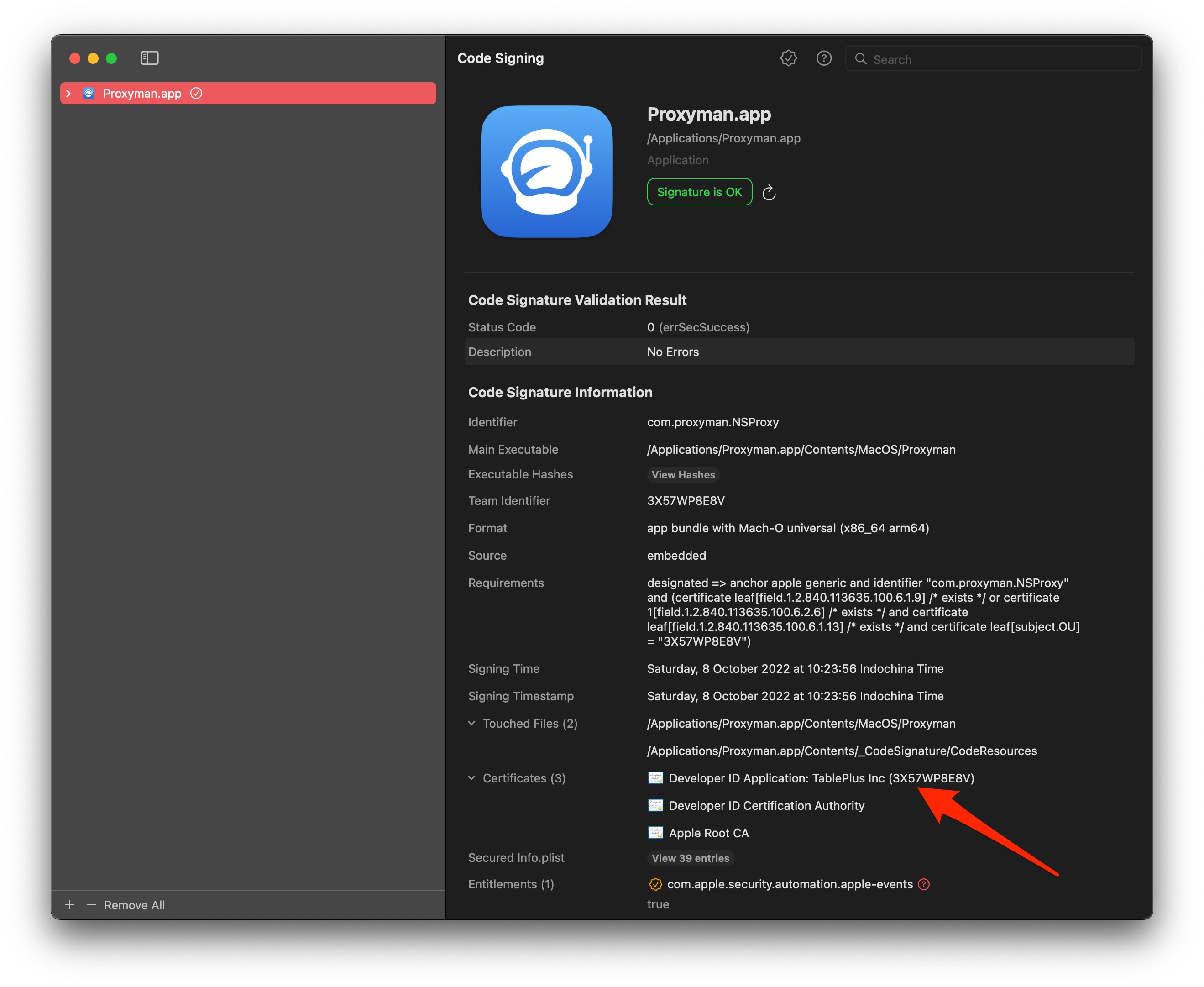 Please notice that Proxyman app and Proxyman Helper Tools are signed with TablePlus Inc Certificate. It's not the TablePlus app.