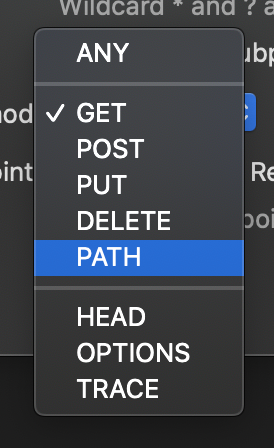 Methoddrop down listPATCHis calledPATH(and I believe this stops the breakpoints working on patch requests)Expected behavior