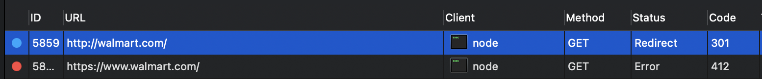 The request is made, however the site redirects to the https://walmart.com/ and that HTTPS request is never shown on Proxyman. I'm wondering how I would get the HTTPS request to show as well on Proxyman.