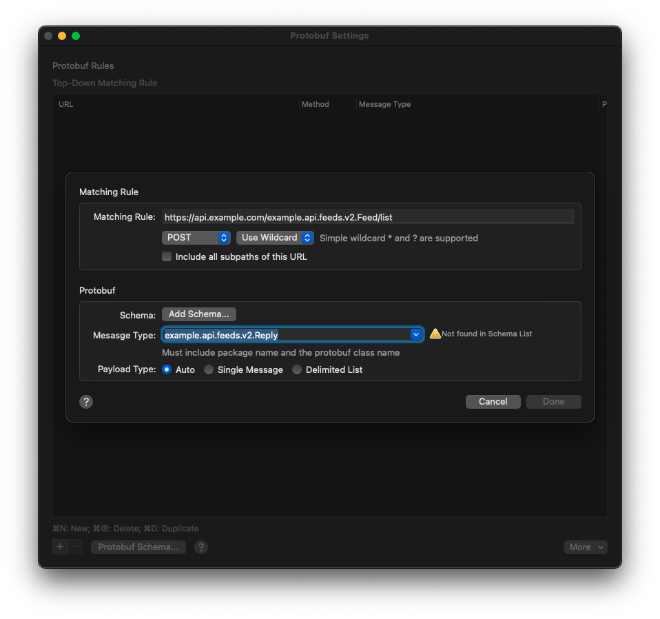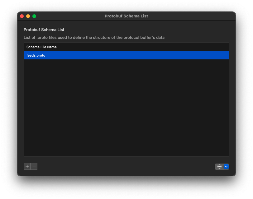 It is also quite tedious to add all the files manually to Protobuf Schema List. This because A.proto might import B.proto, which might import C.proto. It would be great if I can just select the directory which contains all the protobufs I use. If you look at