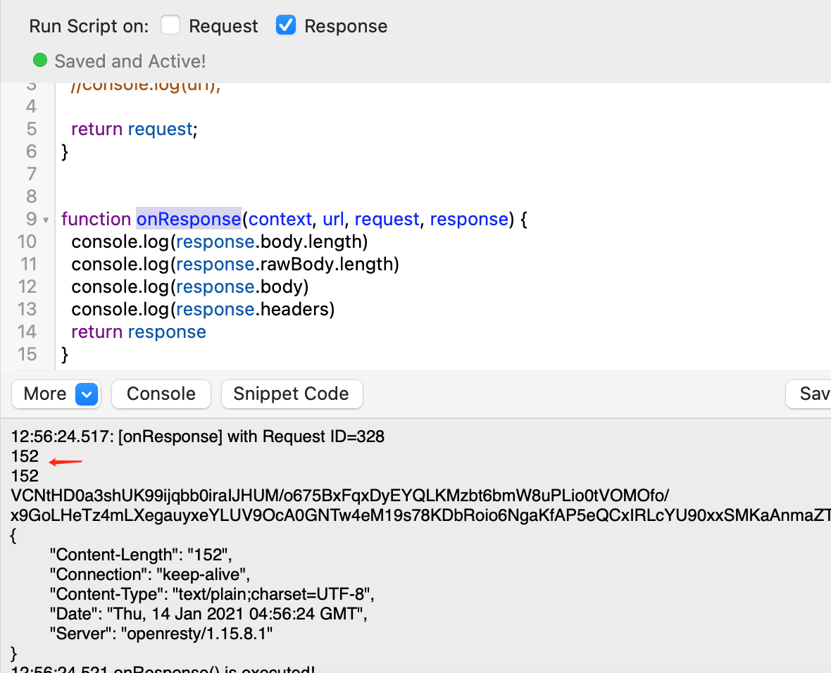 console.log(response.body)is because we convert the binary value to Base64 string since there is no way to pass Binary Data from Swift to the JavascriptCore. Therefore, the string might take 152 in lengths rather than 108 from the binary format.Proxyman also converts the base64 string in the response.body to the binary format too.