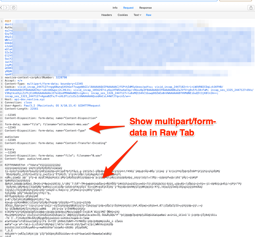 At the moment, the Raw tab of Request and Response doesn't show the binary data or even multipart/form-data too.