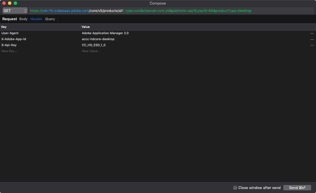 https://cdn-ffc.oobesaas.adobe.com/core/v5/products/all?_type=xml&channel=ccm,sti&platform=osx10,osx10-64&productType=DesktopWith these headers: