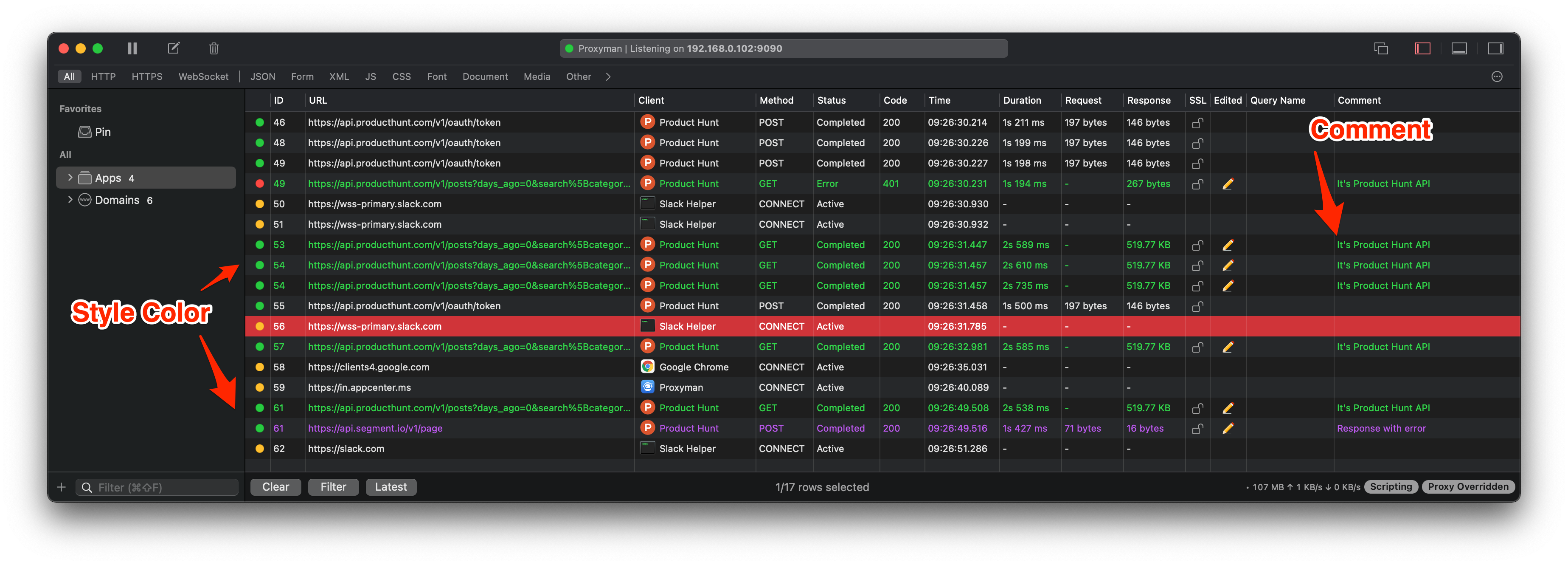 Hey @rukano please check out this beta build: https://proxyman.s3.us-east-2.amazonaws.com/beta/Proxyman_2.31.0_scripting_color_and_comment.dmg