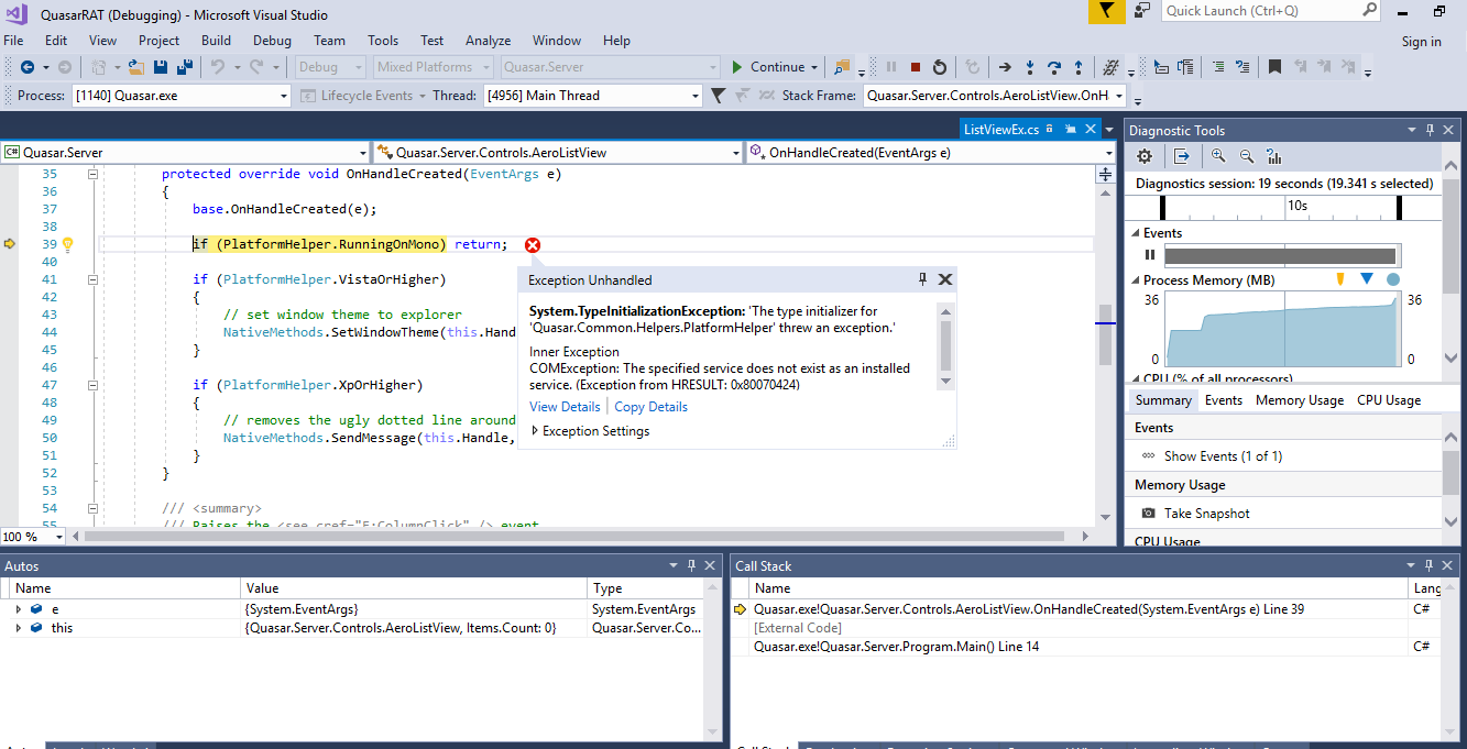 Message=The type initializer for 'Quasar.Common.Helpers.PlatformHelper' threw an exception.