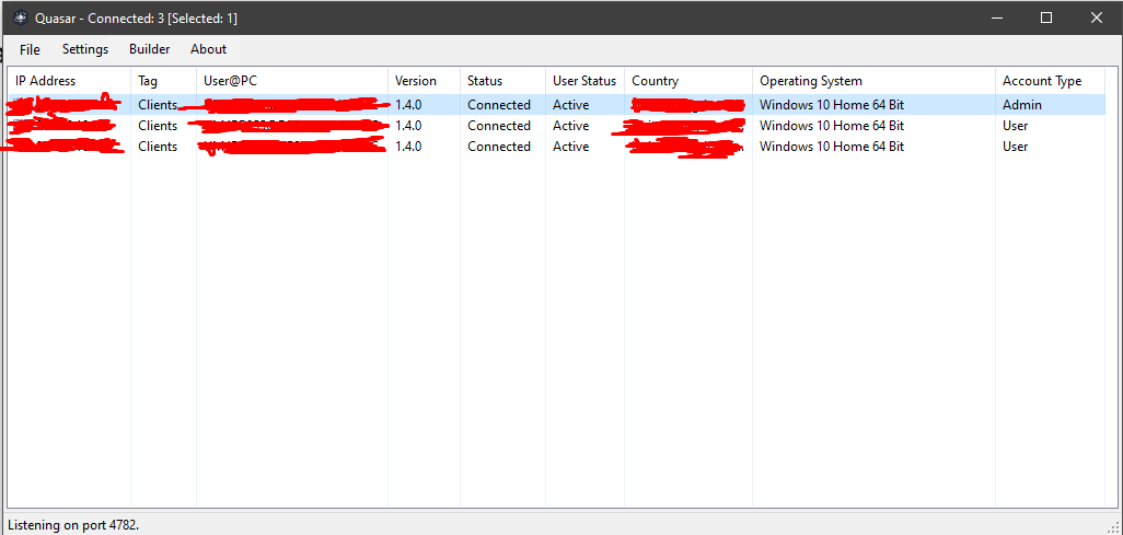 If there is more than one connection, the one that works will be assigned ADMIN privileges whereas the rest will just be USER. The connections with USER will connect to the server but will be uncontrollable by Quasar Server and will only report their connection status.
