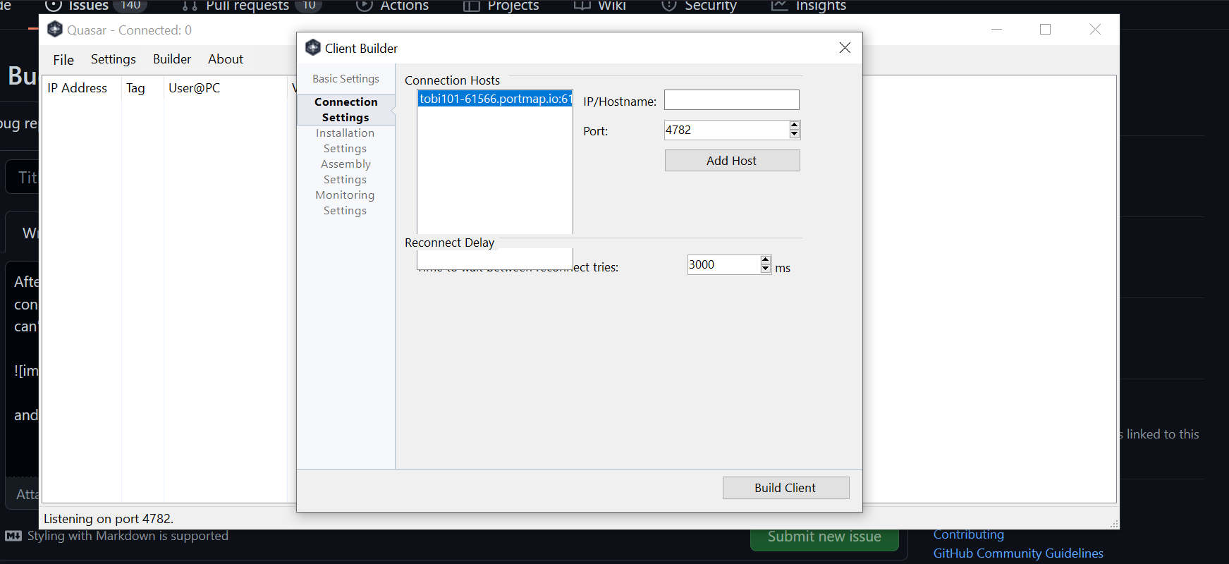 Hmm. Okay you Reset Network TCP/IP stack just to eliminate that as a possible issue and your firewall allows Quasar Server access for traffic it seems (you use port 4782 or or other). You can check if port is open by running "Quasar Server" then go to "https://canyouseeme.org/" to make sure that port (4782 or any other port you decide to use) is in fact open. Also when you "build" the "client" be sure to use as the port "61566" add host port Not 4782 as portmap will forward to port 4782 which Quasar will be listening on and of course you have OpenVPN running as well. I hope this helps.