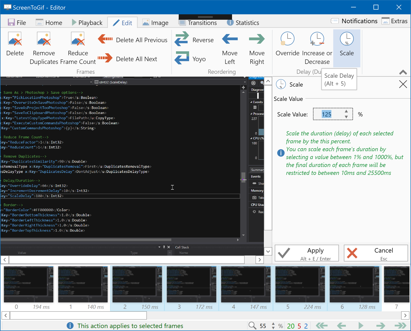 This command allows to change the duration of frames by a scale factor. For example, a 50ms frame will become a 75ms frame if the scale value is 150%.