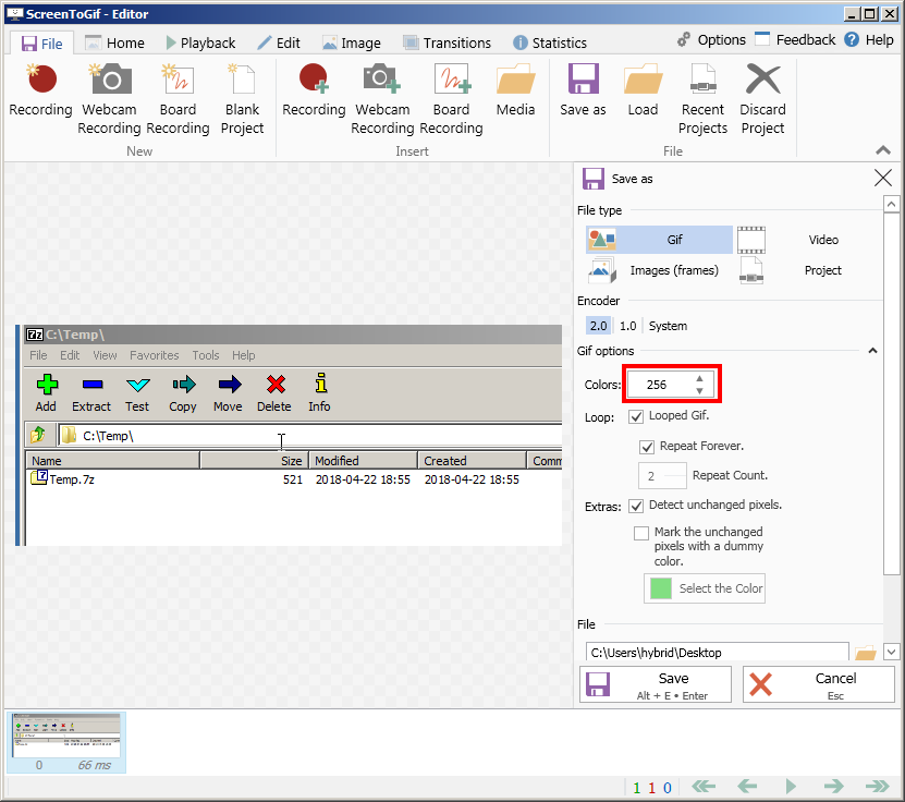 I tried to put together a process to demonstrate how taking images recorded in ScreenToGif and using other tools with converters that remove colors would result in lower file sizes. Strangely, I tried the following workaround and -- for reasons I can't explain, none if to worked. Fewer colors (black and white, 64 color, 8 color even) strangely resulted in LARGER files sizes. I really can't explain why as I've done this previously with other GIF animation tools with very different results.