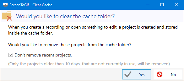In settings, tab Temp files, when you press "Clear TEMP folder" - it will ask a very confusing question for this function "Would you like to save projects, that are 5 days or newer"... Well, it confuses so much. Because option like this, when you want to "clear" or "delete" something - almost in every app it asks "Are you sure?" with "Yes / No" answers. And here what we have - the opposite. User may click "Yes" not even reading the question, and he will not delete projects 5-day old or newer.
