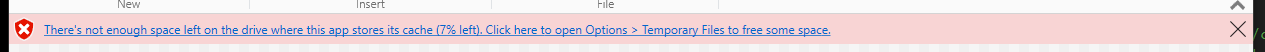 I get the message 'There's not enough space left on the drive where this app stores its cache' (n% left)...'