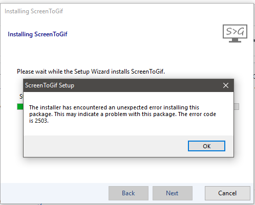 Just some more info for you. I checked the error code 2503 and found some permissions and some other Windows installer issues associated with this code. I checked permissions as well as re-registered the Windows installer and restarted the Installer service. Also tried version 2.13.1 / 2.13.2 and had no luck, same issue. The Windows event logs had nothing more to say either just the error code, nothing more.