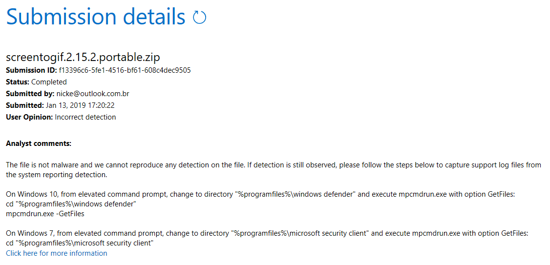 Checking for new virus definitions won't solve this time. I uploaded that file to Microsoft as a false positive detection. Let's see what they say about it.