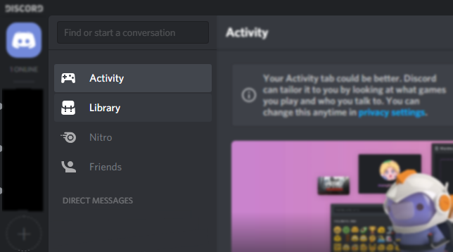 Example 2: Blurring the other elements can help nudge people to the primary options list. Discord's interface is sometimes so colorful it's hard to find what you're looking for. This edit draws the eye to where they can access the top-level screens (Activity/Library/Nitro/Friends).