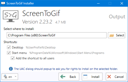 ScreenToGif installer creating a shortcut to: