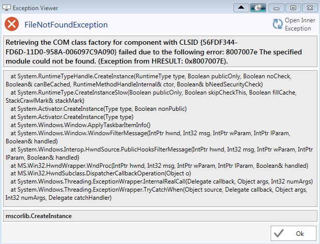 I look log - log say Unable to load DLL 'Shcore.dll' . win 7 no dll. No possible load shcore.dll on win 7? copy dll to C:\Windows\System32 . still crash - unhandled exception. clsid 56fdf344-fd6d-11d0-958a-0060 .......