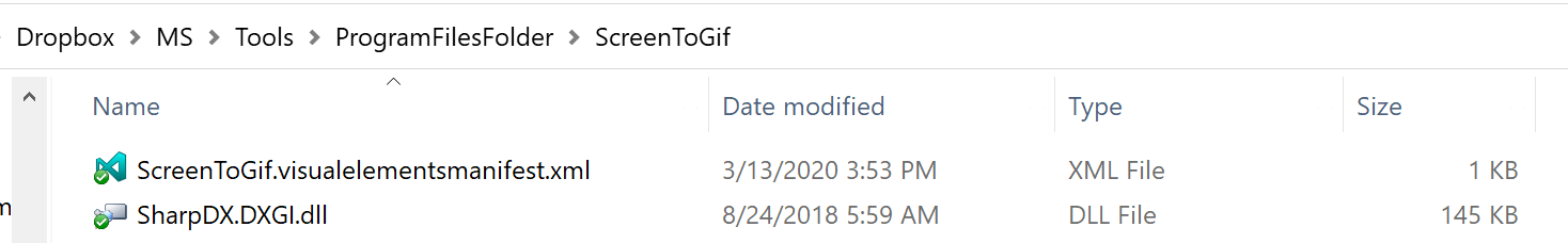 D:\Dropbox\MS\Tools\ProgramFilesFolder\ScreenToGif, which I don't remember creating.Now it has two files: