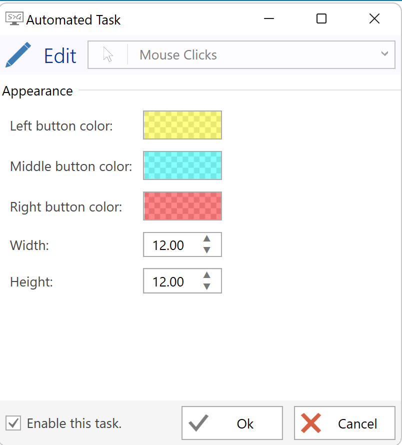 Or if you use automatic tasks, then go to Options -> Tasks and hit "Edit selected item" (selecting first the Mouse clicks task) and you will be able to edit the colors for that automatic task.