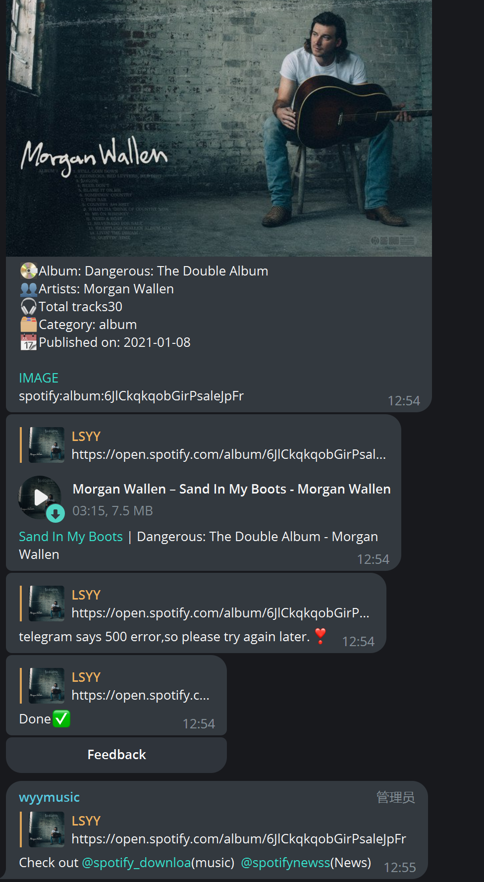 Two Branches are the same,It just downloads one song of the album and shows “telegram says 500 error,so please try again later”,even if I ldownloads a single track,the error still exists