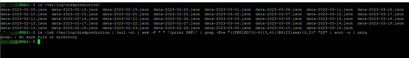 /var/log/diskprediction/data-yyyy-mm-dd.jsonfiles.ls -lah /var/log/diskprediction | tail -n1 | awk -F " " '{print $NF}' | grep -Eow "([FRD]XD?[0-9]{3,4})(RP|II|sas){0,2}" "$f" | sort -n | uniq
