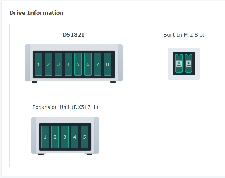 I have like you a DS1821+ with 2 DX517 expansion units attached and the 2 full M2 slots with 2 NVME 2 TB (Crucial CT2000P3SSD8)