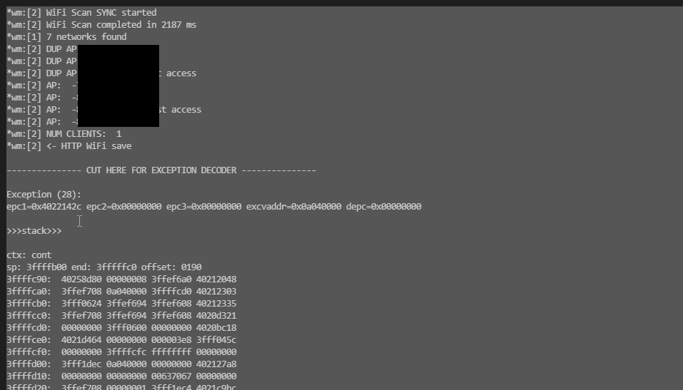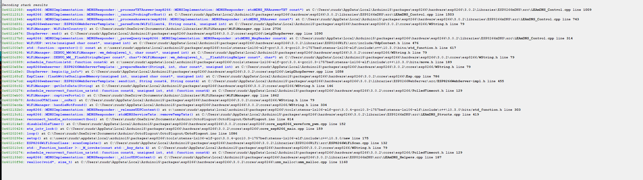 Decoding stack results 0x40212058: esp8266::MDNSImplementation::MDNSResponder::_processTXTAnswer(esp8266::MDNSImplementation::MDNSResponder::stcMDNS_RRAnswerTXT const*) at C:\Users\ruudr\AppData\Local\Arduino15\packages\esp8266\hardware\esp8266\3.0.2\libraries\ESP8266mDNS\src\LEAmDNS_Control.cpp line 1009 0x40212313: esp8266::MDNSImplementation::MDNSResponder::_cancelProbingForHost() at C:\Users\ruudr\AppData\Local\Arduino15\packages\esp8266\hardware\esp8266\3.0.2\libraries\ESP8266mDNS\src\LEAmDNS_Control.cpp line 1503 0x40212345: esp8266::MDNSImplementation::MDNSResponder::_processAnswers(esp8266::MDNSImplementation::MDNSResponder::stcMDNS_RRAnswer const*) at C:\Users\ruudr\AppData\Local\Arduino15\packages\esp8266\hardware\esp8266\3.0.2\libraries\ESP8266mDNS\src\LEAmDNS_Control.cpp line 743 0x4020d331: esp8266webserver::ESP8266WebServerTemplate ::_parseForm(WiFiClient&, String const&, unsigned int) at C:\Users\ruudr\AppData\Local\Arduino15\packages\esp8266\hardware\esp8266\3.0.2\cores\esp8266/WString.h line 79 0x4020bc28: WiFiManager::WiFiSetCountry() at C:\Users\ruudr\OneDrive\Documents\Arduino\libraries\WiFiManager\WiFiManager.cpp line 2736 0x4021d474: DhcpServer::end() at C:\Users\ruudr\AppData\Local\Arduino15\packages\esp8266\hardware\esp8266\3.0.2\cores\esp8266\LwipDhcpServer.cpp line 1090 0x402127b8: esp8266::MDNSImplementation::MDNSResponder::_parseQuery(esp8266::MDNSImplementation::MDNSResponder::stcMDNS_MsgHeader const&) at C:\Users\ruudr\AppData\Local\Arduino15\packages\esp8266\hardware\esp8266\3.0.2\libraries\ESP8266mDNS\src\LEAmDNS_Control.cpp line 314 0x4021c9cc: WiFiUDP::write(unsigned char const*, unsigned int) at C:\Users\ruudr\AppData\Local\Arduino15\packages\esp8266\hardware\esp8266\3.0.2\libraries\ESP8266WiFi\src/include/UdpContext.h line 476 0x401000e9: std::function ::operator()() const at c:\users\ruudr\appdata\local\arduino15\packages\esp8266\tools\xtensa-lx106-elf-gcc\3.0.4-gcc10.3-1757bed\xtensa-lx106-elf\include\c++\10.3.0\bits/std_function.h line 617 0x40209295: WiFiManager::DEBUG_WM (WiFiManager::wm_debuglevel_t, char const*, unsigned int) at C:\Users\ruudr\AppData\Local\Arduino15\packages\esp8266\hardware\esp8266\3.0.2\cores\esp8266/WString.h line 79 0x4020c390: WiFiManager::DEBUG_WM__FlashStringHelper const*, char*>(WiFiManager::wm_debuglevel_t, __FlashStringHelper const*, char*) at C:\Users\ruudr\AppData\Local\Arduino15\packages\esp8266\hardware\esp8266\3.0.2\cores\esp8266/WString.h line 79 0x40100389: schedule_function(std::function const&) at c:\users\ruudr\appdata\local\arduino15\packages\esp8266\tools\xtensa-lx106-elf-gcc\3.0.4-gcc10.3-1757bed\xtensa-lx106-elf\include\c++\10.3.0\bits/move.h line 189 0x4020e58e: esp8266webserver::ESP8266WebServerTemplate ::_prepareHeader(String&, int, char const*, unsigned int) at C:\Users\ruudr\AppData\Local\Arduino15\packages\esp8266\hardware\esp8266\3.0.2\cores\esp8266/WString.h line 79 0x4021d3e0: DhcpServer::begin(ip_info*) at C:\Users\ruudr\AppData\Local\Arduino15\packages\esp8266\hardware\esp8266\3.0.2\cores\esp8266\LwipDhcpServer.cpp line 1058 0x402168cf: EspClass::flashWriteUnalignedMemory(unsigned int, unsigned char const*, unsigned int) at C:\Users\ruudr\AppData\Local\Arduino15\packages\esp8266\hardware\esp8266\3.0.2\cores\esp8266\Esp.cpp line 786 0x4020e7cd: esp8266webserver::ESP8266WebServerTemplate ::send(int, String const&, String const&) at C:\Users\ruudr\AppData\Local\Arduino15\packages\esp8266\hardware\esp8266\3.0.2\libraries\ESP8266WebServer\src/ESP8266WebServer-impl.h line 455 0x40208c32: WiFiManager::getInfoData(String) at C:\Users\ruudr\AppData\Local\Arduino15\packages\esp8266\hardware\esp8266\3.0.2\cores\esp8266/WString.h line 146 0x40100274: schedule_recurrent_function_us(std::function const&, unsigned int, std::function const&) at C:\Users\ruudr\AppData\Local\Arduino15\packages\esp8266\hardware\esp8266\3.0.2\cores\esp8266/PolledTimeout.h line 129 0x4020eb00: WiFiManager::captivePortal() at C:\Users\ruudr\OneDrive\Documents\Arduino\libraries\WiFiManager\WiFiManager.cpp line 1862 0x40206b78: ArduinoOTAClass::_onRx() at C:\Users\ruudr\AppData\Local\Arduino15\packages\esp8266\hardware\esp8266\3.0.2\cores\esp8266/WString.h line 79 0x4020ecda: WiFiManager::handleNotFound() at C:\Users\ruudr\AppData\Local\Arduino15\packages\esp8266\hardware\esp8266\3.0.2\cores\esp8266/WString.h line 334 0x402132b0: esp8266::MDNSImplementation::MDNSResponder::_releaseUDPContext() at c:\users\ruudr\appdata\local\arduino15\packages\esp8266\tools\xtensa-lx106-elf-gcc\3.0.4-gcc10.3-1757bed\xtensa-lx106-elf\include\c++\10.3.0\bits/std_function.h line 303 0x40213c51: esp8266::MDNSImplementation::MDNSResponder::stcMDNSServiceTxts::removeTempTxts() at C:\Users\ruudr\AppData\Local\Arduino15\packages\esp8266\hardware\esp8266\3.0.2\libraries\ESP8266mDNS\src\LEAmDNS_Structs.cpp line 419 0x40201baa: reconnect_handle_autoconnect(bool) at C:\Users\ruudr\OneDrive\Documents\Arduino\OctoPlugout\OctoPlugout/OctoPlugout.ino line 814 0x401014e8: disableIdleTimer() at C:\Users\ruudr\AppData\Local\Arduino15\packages\esp8266\hardware\esp8266\3.0.2\cores\esp8266\core_esp8266_waveform_pwm.cpp line 152 0x40100424: ets_intr_lock() at C:\Users\ruudr\AppData\Local\Arduino15\packages\esp8266\hardware\esp8266\3.0.2\cores\esp8266\core_esp8266_main.cpp line 159 0x40202048: loop() at C:\Users\ruudr\OneDrive\Documents\Arduino\OctoPlugout\OctoPlugout/OctoPlugout.ino line 1086 0x4020298e: setup() at c:\users\ruudr\appdata\local\arduino15\packages\esp8266\tools\xtensa-lx106-elf-gcc\3.0.4-gcc10.3-1757bed\xtensa-lx106-elf\include\c++\10.3.0/new line 175 0x4021c45c: ESP8266WiFiScanClass::scanComplete() at C:\Users\ruudr\AppData\Local\Arduino15\packages\esp8266\hardware\esp8266\3.0.2\libraries\ESP8266WiFi\src\ESP8266WiFiScan.cpp line 132 0x402010c4: std::_Function_handler >::_M_invoke(const std::_Any_data &) at C:\Users\ruudr\AppData\Local\Arduino15\packages\esp8266\hardware\esp8266\3.0.2\cores\esp8266/WString.h line 79 0x40100274: schedule_recurrent_function_us